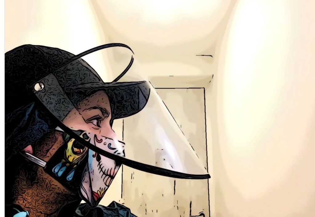 Me desnudo y me pongo mi traje postapocalíptico, que consiste en unos pantalones anchos de colores que compré en una tienda Hindú, una chaqueta morada que ya iba a tirar, pero que salvó la peste porque es liviana y tiene una capucha que cubre mi pelo, un tapabocas con sonrisa de catrina macabra que impide la entrada o salida del virus, una gorra con una pantalla de plástico que cubre mi rostro, unos guantes que tiro a la lavadora a mi regreso, medias negras que pongo por encima de los pantalones para que no se arrastren y zapatos blancos de quitar y poner fácilmente. Mi pinta me hubiera causado problemas hace unos meses, cuando el debate consistía en permitir o no a los jóvenes cubrir sus rostros en las protestas de noviembre. Salir sin tapabocas en cambio, me causaría problemas ahora, cuando hay policías por todas las calles linchando a gordos y viejos por ser población de alto riesgo y a desenmascarados por poner en riesgo la salud pública.